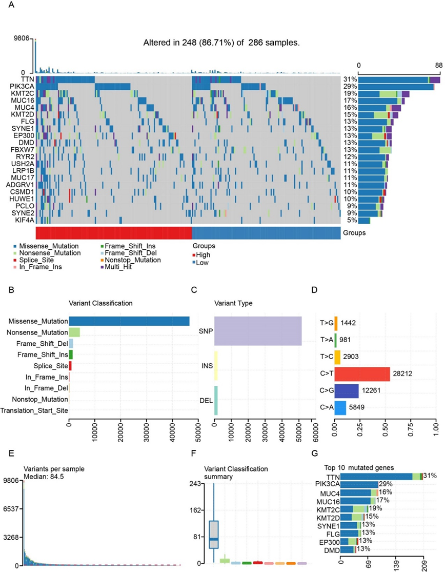 Figure 5. The alterations in mutations between KIF4A-High and KIF4A-Low patients. (A) Onco-plot of somatic landscape in the KIF4A-high and KIF4A-low groups. (B-G) Cohort summary plot of variant classification, type and SNV class, mutation load of each sample, variant classification and the top ten mutated genes.