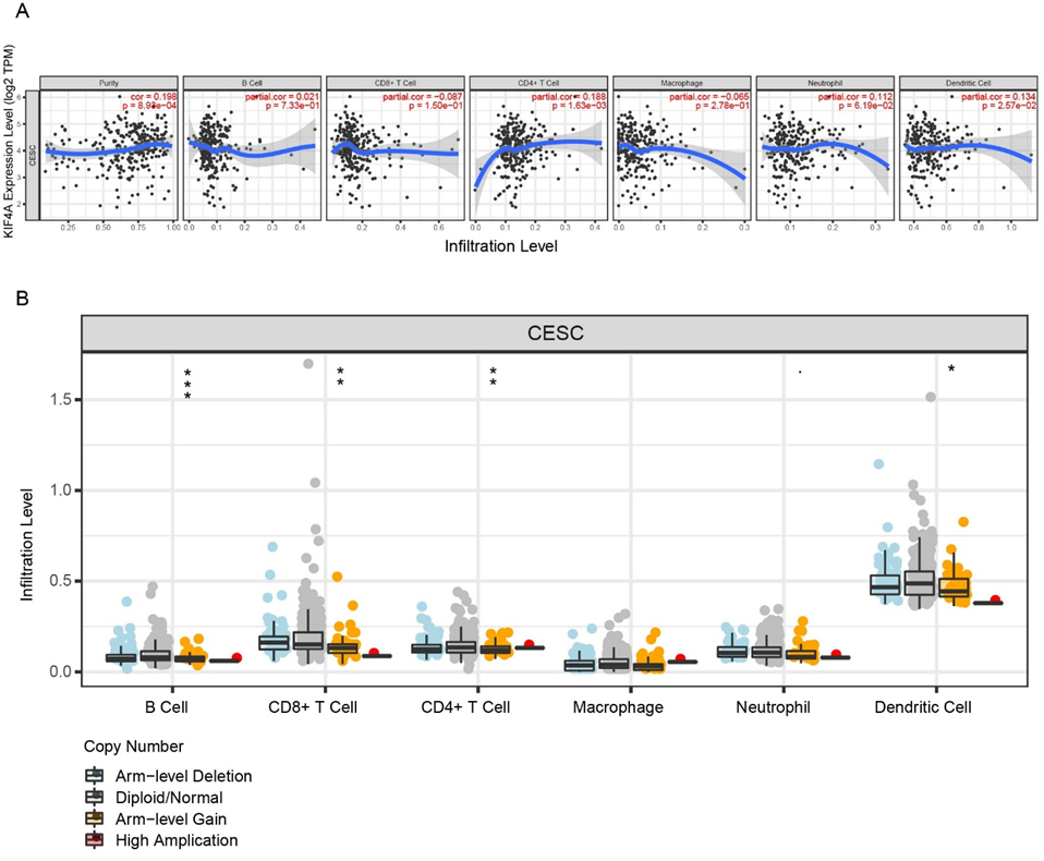 As found in the KEGG pathway analysis, we hypothesis the KIF4A may affect tumor immune activity and regulate cervical cancer progression. Therefore, we used the TIMMER tool to test the correlation between KIF4A expression and infiltration levels of six immune cell subtypes. As