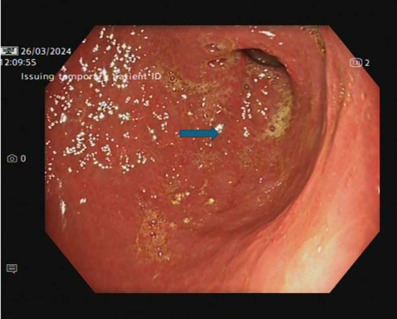 Image 4: OGD- Stomach Antrum post 5th dose of infliximab (nicely healed mucosa, mild antral gastritis- arrow)