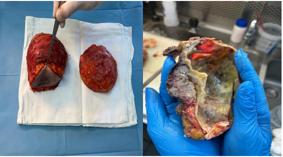 Figure 5.A- Intraoperative image of the en bloc speciemen of the tumor, B- a section through the tumor mass