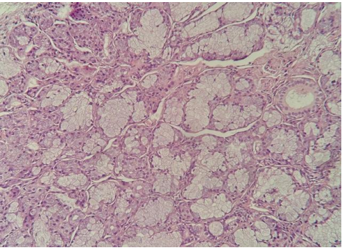 Figure 7: Minor salivary gland tissue showing rare scattered lymphocytes with no aggregate formation, corresponding to a Focus Score<1>