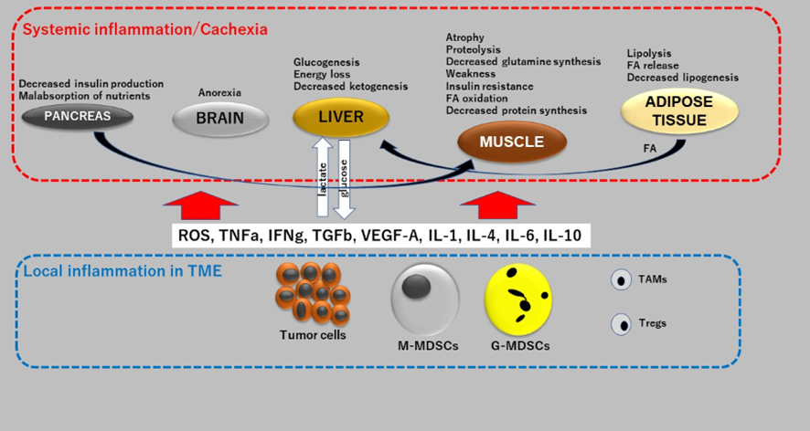 Although the mechanisms that induce cancer cachexia has been widely studied, detailed mechanisms and relationship among inflammatory mediators and organs affected in cancer cachexia are not fully clarified yet.