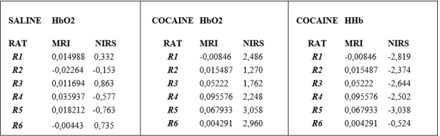 Table 1 shows the raw MRI and NIRS data expressed in micromole/L obtained in the associated two groups of animals i.e. receiving saline (control group) or cocaine treatment. In particular the data are mean concentration in the time interval 3 to 8 min after injection of saline or cocaine. They are compared to the related measurements performed during the 5 min control/control period, which are considered as zero micromole/L. In particular HbO2 data are presented for the saline group of animals while HbO2 and HHb values are shown for the cocaine group of rats.