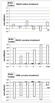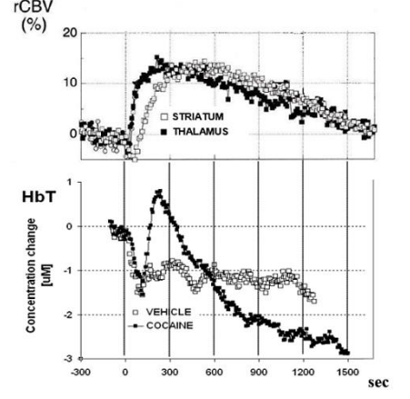 In a recent work, comparison of the effects of cocaine treatment upon Near Infrared Spectroscopy (NIRS) as well as Magnetic Resonance Imaging (MRI) parameters were monitored in vivo in rat brain. Data gathered proposed correspondence of evaluation between the two methodologies when monitoring cerebral blood volume.