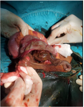 The patient was managed in the ward with supportive management and planned for induction of labor using a uterotonic agent (misoprostol) for 12 hours; however, she had a poor progress of labor, and labour dystocia. Then she was planned for a laparotomy secondary to labor dystocia and IUFD. Intraoperative findings: abdomen was opened in layers through Sub umbilical midline incision, fetus, and the placenta was found incidentally in the abdominal cavity with the placenta being sited in the porch-like structure beneath the Transverse(Figure A, B) and ascending colon(Figure C).
