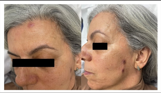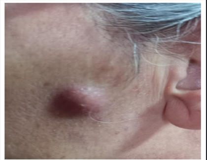 Figure 2: Two erythematous-violaceous nodulations with hardened consistency in the left malar region and ipsilateral mandibular angle, and one erythematous-violaceous nodulation with hardened consistency, approximately 1 cm in size, in the left upper forehead region, near the hairline.