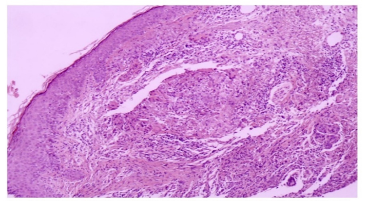 Figure 3: Anatomopathological image of the incisional biopsy of a nodule in the left malar region at 20x magnification, showing chronic granulomatous inflammation in the superficial dermis. Acid-fast bacillus and fungal tests using Ziehl-Neelsen, Fite-Faraco, PAS, and Grocott stains were negative.