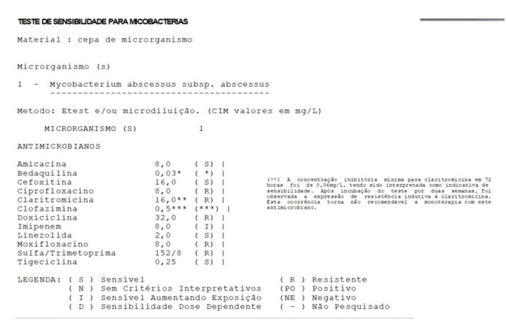 The Mycobacterium abscessus complex includes rapidly growing mycobacteria with a high frequency of antimicrobial resistance. Literature reports cases acquired through surgical procedures, mesotherapy, acupuncture, tattoos, and nail treatments⁹. Treatment is not consensual; in general, a combination of macrolides (clarithromycin is typically the choice) with parenteral antibiotics (amikacin, cefoxitin, tigecycline, or imipenem) is used. Treatment usually lasts 4 to 6 months, with possible surgical debridement. When choosing the treatment, it is crucial to consider the antibiogram and each patient’s profile¹⁰.