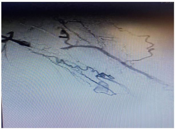 The patient was urgently submitted to an endovascular treatment of the AVF and brachial artery acute thrombosis. Under general anesthesia, a left common femoral artery was retrograde punctured guided with a duplex ultrasound to perform the whole intervention percutaneously with a proper sheat. Then, upper left arm arteriography showed: brachial artery occlusion immediately before stenting, with brachial artery refilling before anastomosis focal venous stenoses. (Figures 1 and 2).