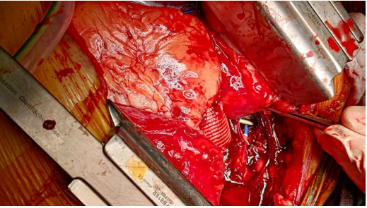Subsequently, the patient experienced rapid hemodynamic instability, leading to multiple episodes of ventricular fibrillation. Several direct current (DC) shocks and prolonged internal cardiac massage (approximately 40 minutes) were required. A new venous access via the left femoral vein was established after approximately 15 minutes. Recommencing the cardiopulmonary bypass was extremly challenging and ‘= was not possible. Despite maximal resuscitative efforts, the patient unfortunately succumbed intraoperatively.