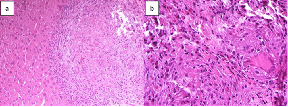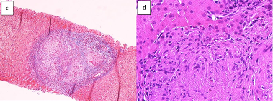 A liver biopsy was performed with the evidence of granulomatous inflammation inside the portal spaces, damage to the bile canaliculi and the presence of giant cellular epithelioid elements. The leading differential diagnosis for our patient included primary biliary cholangitis and hepatic sarcoidosis. In the suspicion of liver localization of sarcoidosis the patient underwent a chest CT scan and a pneumological consultation, both excluded pulmonary sarcoidosis. We carried on the diagnostic process by performing PET-CT scan with 18 FDG (figure1) which described non-homogeneous distribution of radiopharmaceutical contrast in the liver, with some areas of hyper-uptake in particular between the second and fourth segments and a focality in the upper third of the spleen, highly suggestive for hepatic and splenic localizations of sarcoidosis. The case was discussed in a multidisciplinary setting suggesting to perform a liver biopsy based on PET-CT images. Therefore, the patient underwent a second ultrasound-guided liver biopsy in the PET-CT marked area. The histological report was conclusive for noncaseous granuloma, highly suggestive of localized sarcoidosis (figure 2). Diagnostic work up excluded alternative infective and immune-mediated causes of granulomatous disease. She was started on prednisone in combination with ursodeoxycholic acid (UDCA), with normalization of GGT and ALP.