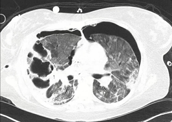 A 31-year-old woman G4P2204 was admitted with respiratory failure. Her laboratory work showed that her hemoglobin was 9.7 g/dl, D-dimer 1349 ng/mL fibrinogen equivalent units procalcitonin 0.44 ng/mL, C reactive Protein 91.4 mg/L, normal white count and her nasal reverse transcription-polymerase chain reaction was positive for SARS-CoV-2. Her Chest x-ray showed bilateral patchy airspace opacities. She underwent emergent cesarean section, was intubated and placed on mechanical ventilation. She was treated with Remdesivir, dexamethasone, vancomycin and piperacillin-tazobactam. On day 11 she developed bilateral pneumothorces which required placement of emergent chest tubes. There was a new elevation in white blood count (16,000/ul) and inflammatory markers. She reached threshold of mechanical ventilatory support so additional support with extracorporeal membrane oxygenation (ECMO) was initiated. On day 15 her Computed Tomography (CT) chest showed a large multiloculated cavity (Figure 1). She underwent Bronchoscopy with BAL and the cultures were noted to be positive for Mucorales (Lichtheimia species). A diagnosis of Pulmonary Mucormycosis was made. There was no evidence of invasive disease on CT abdomen-pelvis, CT head and nasal endoscopy. No tissue pathology was obtained. She was started on treatment with amphotericin B and posaconazole. On day 21 she underwent tracheostomy and successful ECMO weaning in addition to the removal of bilateral chest tubes. Amphotericin B was discontinued, and she was discharged on supplemental oxygen through nasal cannula and oral posaconazole. She continued to show clinical and radiological improvement on outpatient follow-up in clinic visits.