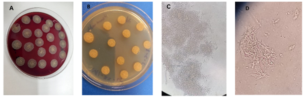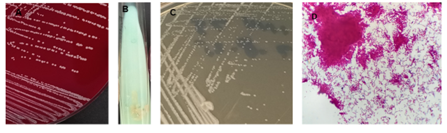Figure 3: Cultures and microscopic images of Mycobacterium chelone. A. Culture on blood agar, from blood culture, at 30°C, for 72 h. B. Culture on Lowenstein-Jensen stain at 37 °C, for 72 h. C. Culture on Sabouraud dextrose agar with chloramphenicol added, at 30 °C, for 72 h. D. Microscopic image, using Ziehel-Neelsen staining, 100x, showing individual acid-fast cells, resembling branched bacilli.