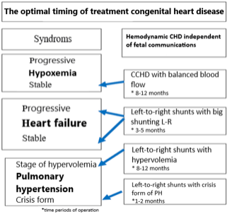 One of the most “troubled” patient groups is the one with left-to-right shunts complicated by the pulmonary hypertension crisis (PH). At the age of 1.5-2 months when the patient is suffering from pulmonary hypertension crisis or its analogues, surgical treatment is indicated. Options for one- or two-stage treatment are selected from the standpoint of collective experience and the reliability of the result. Such patients make up about 15%. Complex cyanotic heart disease (CCHD) with balanced pulmonary blood flow, stable hemodynamics and stable hypoxemia is operated on in accordance with the Fontaine principle, not in 3, but in 2 stages, others - the tetralogy of Fallot, a double-chambered right ventricle, etc. - are operated on radically and instantaneously. Congenital heart defects with a large left-to-right shunt and low pulmonary resistance begin to decompensate through a hyperkinetic heart syndrome, which is an indication for surgical treatment. These patients constitute about 17%. The remaining majority of patients - 65-70% have the ability to grow up to a year or older. A grown child has a significantly lower overall surgical risk. We have determined the recommended timeframe to provide surgical treatment for congenital heart disease based on the literature data and more than 20 years’ worth of clinical experience that culminated in the realization that the patient’s low weight and small age are in and of themselves factors that aggravate the already high risk of surgical interference. The long-term postoperative complications alone can be explained by the high hydrophilic properties of a newborn’ skin that has to be sewn up and the high growth rate of organs and systems in the first year of life. Based on this stipulation, we believe that the formula “the sooner the better” does not work for all heart defects.