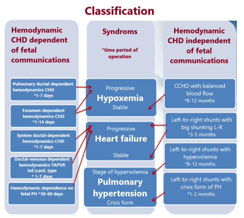 In this classification, patient groups and optimal timing of their treatment are clearly identified, which is very important in formulating a treatment strategy. However, this classification lacks names of defects and reasons-indications for surgical treatment. We decided to make up for this shortcoming based on the possible, probable, and the occurred hemodynamic disturbances, using virtually the same congenital heart disease groups. The first version is as follows (Figure 1).