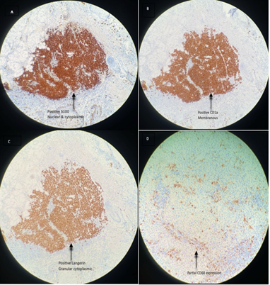 Figure 4: Immunohistochemistry of the LCH. (A) S100 (10x). (B) CD1a (10x). (C) Langerin (10x). (D) CD68 (20x)