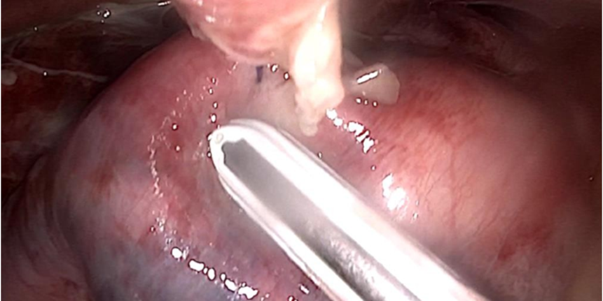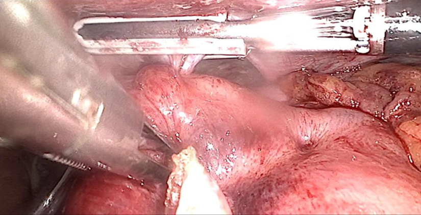 Figure 2: Transmural suture bites from the ESG involving the parietal peritoneum of the left hemidiaphragm.
