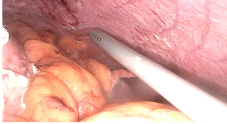 Figure 1: Localized peritonitis with transmural suture bites from the ESG involving the parietal peritoneum of the anterior abdominal wall.
