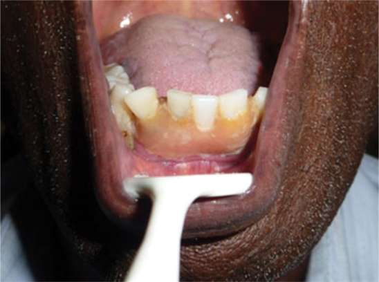 Interestingly, the DMF index in this group ranged from 0 to 21 and the mean was 3.42. The mean number of decayed teeth was 2 and the mean number of missing teeth was 1.5. None of the 43 patients had any fillings. Regarding the periodontal status, using the James Index, 13 patients (30%) had good oral hygiene, 15 (35%) had fair oral hygiene and 15 (35%) had poor oral hygiene. Only one patient had a prosthesis, which was a fixed acrylic device on the lower anterior teeth (Figure 6).
