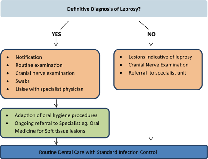 If there is no definitive diagnosis, but leprosy is suspected, then, following routine history and examination, cranial nerve testing should be done with referral to a specialist unit. Liaison with the consultant in communicable diseases should also be considered. All patients should be given routine dental care using standard infection control as the disease has low rates of infectivity.
