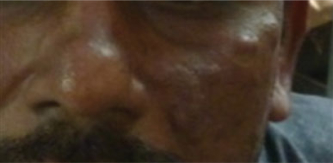 Nine patients (21%) were found to have cranial nerve impairment. Five patients (12%) were found to have involvement of the trigeminal nerve and four patients (9%) had involvement of the seventh cranial nerve. Twenty-one patients (49%) had extra-oral lesions which included nodules, erythema and hypopigmented patches of anaesthesia (Figures 1 and 2). Twelve patients (28%) had intra-oral lesions which included sinuses and diffuse areas of hyperpigmentation (Figures 3 and 4). Out of these 12 patients, nine (21%) also chewed either paan, or tobacco or both. Only one patient had intra-oral ulceration and this was in the gingivae above the upper left central the patients examined exhibited any bony or skeletal changes. Figure 1