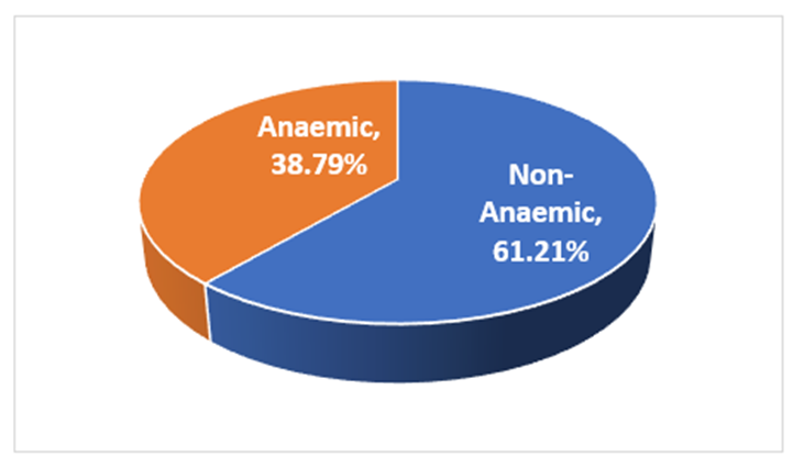 More than half of the respondents reported frequent tiredness (52.59%), while 41.95% experienced frequent headaches, and 37.07% reported dizziness or light-headedness. Paleness was noticed by 31.90% of participants (Table 5). The mean age of respondents was 25.74 ± 4.89 years, with a mean BMI of 22.64 ± 3.91 kg/m². The overall mean haemoglobin level was 12.41 ± 1.67 g/dL, with males having a higher mean value than females (Table 6). Based on WHO criteria, 38.79% of the respondents were anaemic, while 61.21% were non-anaemic (Figure 1). Among those with anaemia, 45.19% had mild anaemia, 38.52% had moderate anaemia, and 16.30% had severe anaemia (Figure 2).