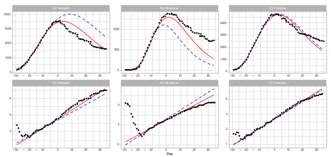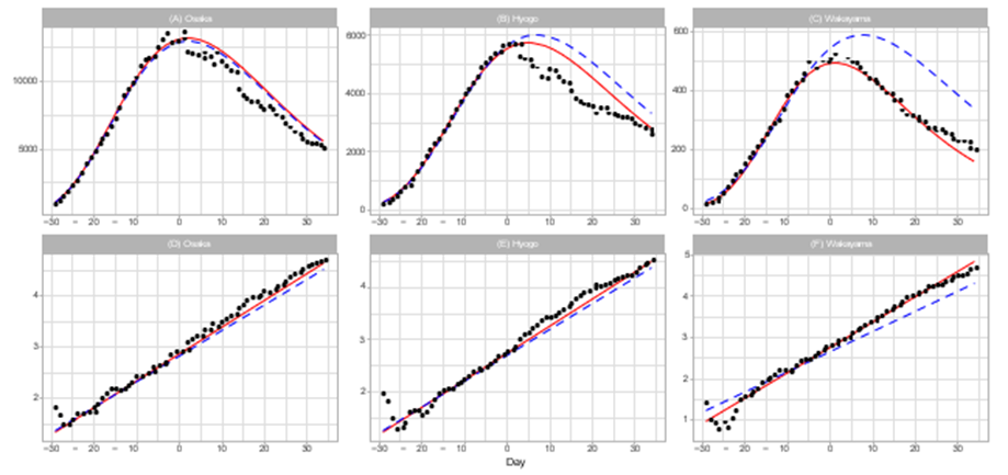 Figure 3 shows the reported data and the Gompertz model estimation for Aichi (left), Gifu (center), and