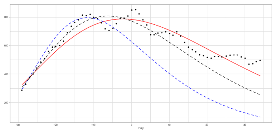 Figure 5: Daily numbers of Tochigi. The red solid line represents W [-11,0], the blue dashed line represents W [-15, -4], and the black dashed line represents W [-19, -8] Closed circles indicate reported data.
