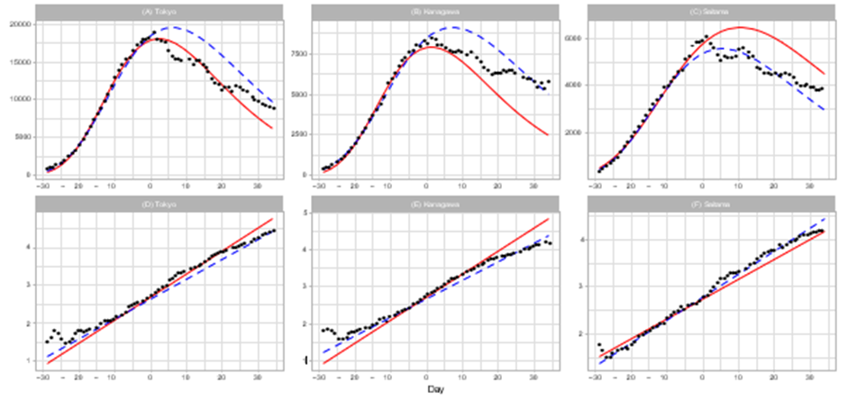 First, we analyzed the daily infection numbers in Tokyo, Kanagawa, and Saitama during the sixth outbreak. These prefectures collectively account for 24.5% of Japan’s population. Day 1 corresponds to February 5 for Tokyo, February 7 for Kanagawa, and February 8 for Saitama.