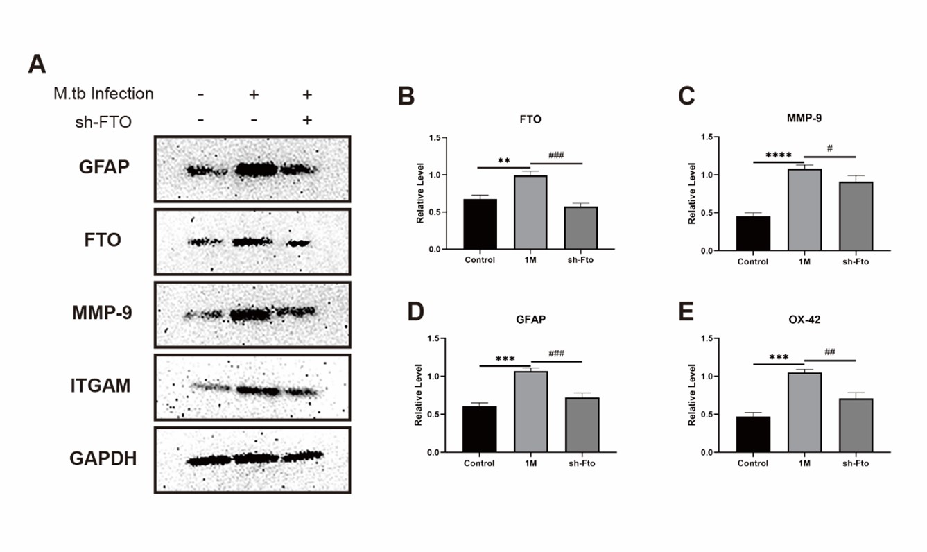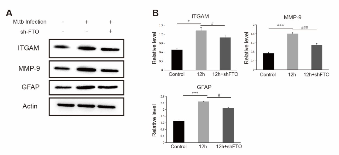 Based on a high-throughput analysis, we found that FTO is transcriptionally activated in patients with TBM. We then validated that Tuberculous induced the expression of FTO in isolated mouse microglia and in mouse brain, which further increased the expression of matrix Metalloproteinase-9 (MMP-9) and Integrin alpha-M (ITGAM, or OX42). Knockdown of FTO dramatically abrogates the up-regulation of MMP-9 and OX42. FTO depletion also restores the Tuberculous -induced microglial apoptosis. We further validated that increased FTO can reduce m6A modifications in MMP-9 and OX42 transcripts.