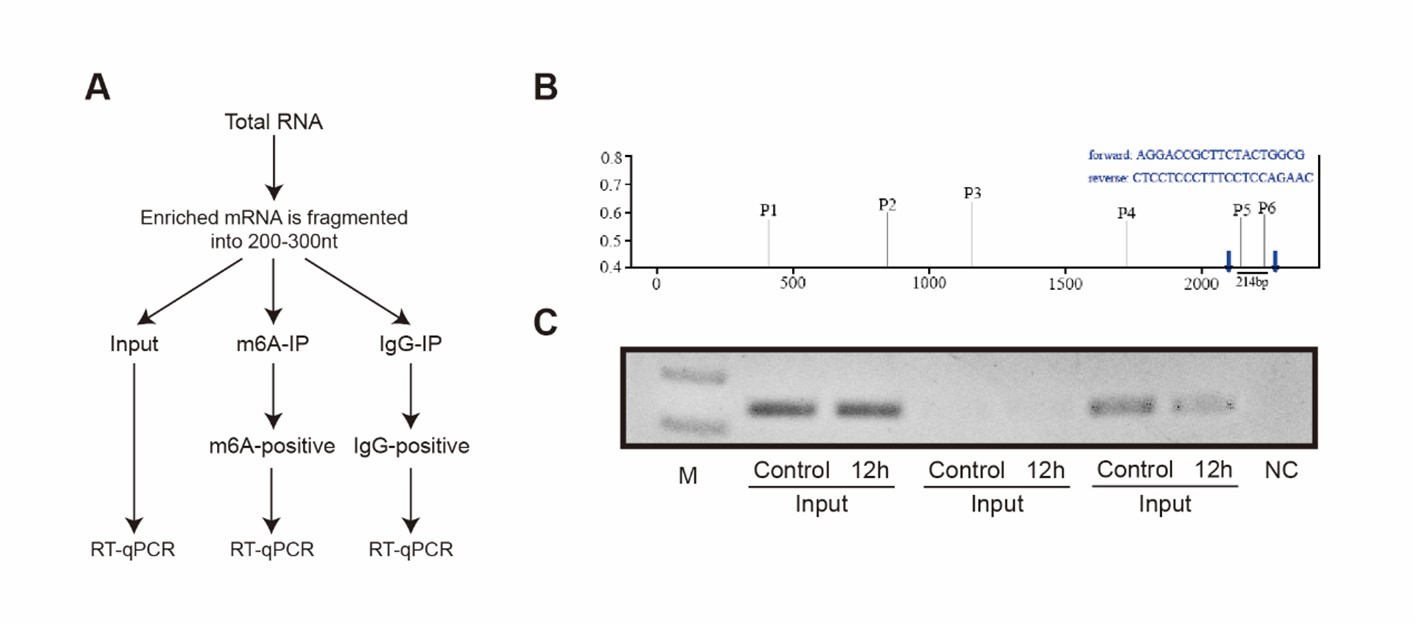 Total RNA was extracted from primary microglial cells using TRIzol (Invitrogen, USA) and treated by DNase I (Sigma Aldrich, USA). rRNA was removed using RiboMinus Eukaryote Kit (Invitrogen, USA). RNAs were then physically fragmented by sonication for 10 seconds on a mixture of ice and water. For MeRIP, RNA fragments were incubated with an anti-N6-methyladenosine antibody (1:1,000, Abcam, USA) or control IgG (1:1,000, Cell Signaling Technology, USA) conjugated to magnetic beads (Invitrogen, USA) in Magna RIP buffer (MilliporeSigma, USA) overnight at 4 °C. The beads were then incubated with Proteinase K for 1.5h at 42 °C. Phenol-chloroform extraction method was used to isolate RNAs. Methylated RNA levels were determined by RT-qPCR followed by agarose gel electrophoresis.