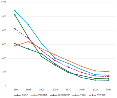 Recent Trends (2010-2021): The rate of improvement continued but showed some moderation. To put the numbers into perspective, India was able to reduce the rates by a further 57% (from 215.7 to 93.4). Pakistan reduced its rates by 42% (371.3 to 214.4). Bangladesh enhanced its percentage by 43% (201.1 to 113.8) whilst Nepal’s rate decreased by 51% (333.9 to 164.3)