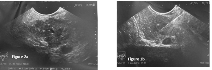 Figure 2a: 13 mm cyctic lesion obstructing the wirsung which is dilated upstream.