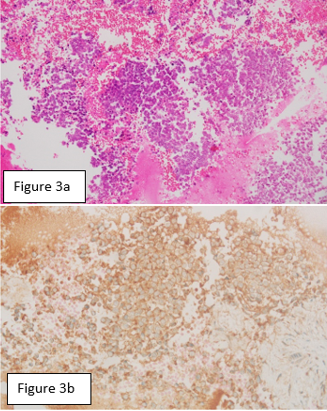Echo endoscopic ultrasound showed a 13 mm cystic lesion obstructing the wirsung (figure 2). FNA and core biopsy was positive for a small blue cell tumor and positive for CD99. These findings were consistent of extension of Ewing sarcoma (figure 3).