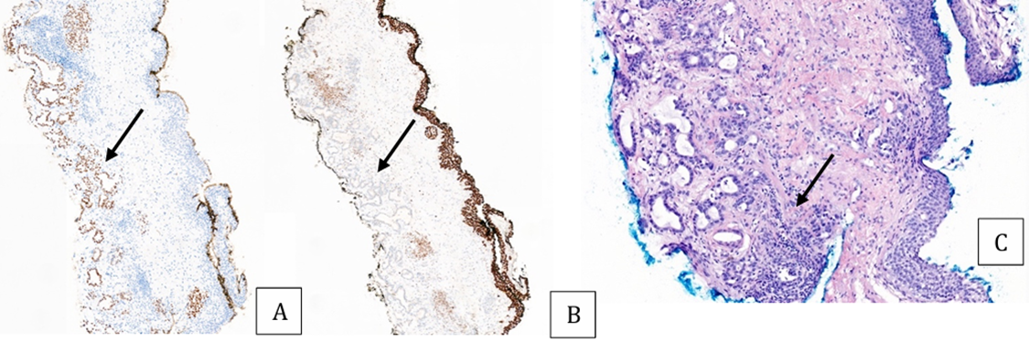 Pathology from the TURBT (cold and warm) revealed invasive adenocarcinoma comparable to the patient’s known esophageal adenocarcinoma. Immunohistochemical staining was positive for p53 and Caudal Type Homeobox 2 (CDX2), and negative for GATA3 and Cytokeratin 20 (CK20), confirming metastatic esophageal adenocarcinoma (see Figure 3).