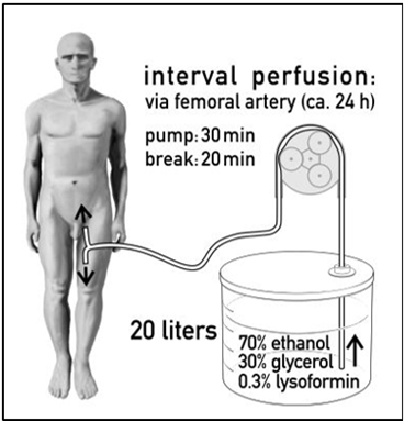 Figure 2: 2a: Interval perfusion mechanism 2b: Interval perfusion mechanism in body donors via femoral artery. on body donors with ethanol glycerol.