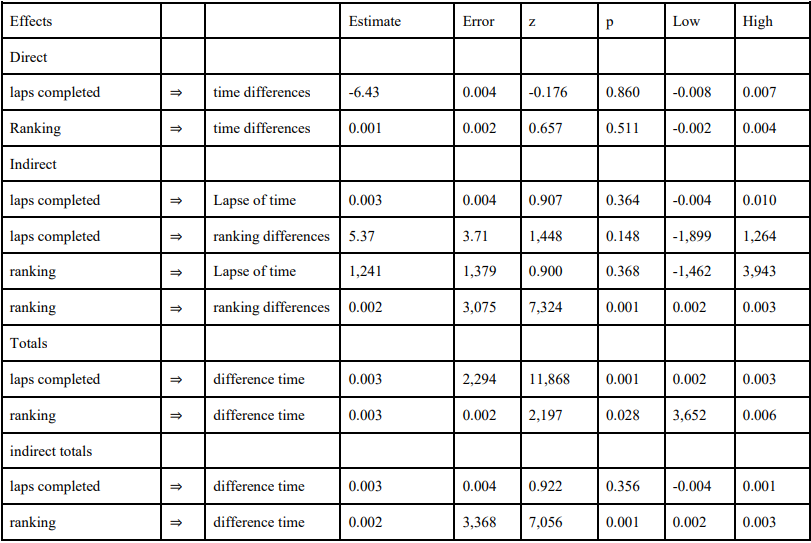 The stochastic effect relationships indicate the possibility of contrasting the hypotheses related to the direct and indirect determinants of the time differences observed in the IndyCar events from 2020 to 2023. In this sense, a trajectory model allowed establishing the effects by comparing them to be able to anticipate opportunity scenarios. In other words, the empirical model suggests the non-rejection of the hypotheses regarding direct and indirect predictions from the observed determinants.