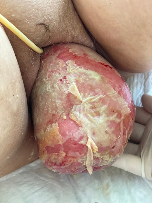 When examining the external genitalia, a complete GP is visualized with a pinched prolapsed pelvic hernia, which was located outside the vulvar ring in the form of a tumor-like formation measuring 15x15 cm. The mucous membrane of the vagina, prolapse pelvic hernia, with signs of inflammation, edema, and inflammatory-trophic changes (Figure.1).