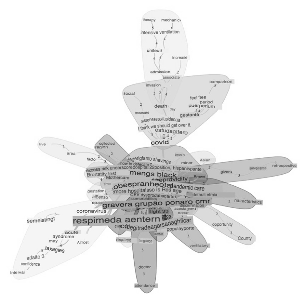 Using the software, a word cloud was generated where the frequency of words in the text corpus is visualized, where the size of each word is proportional to its frequency in the analyzed text. Highlighted words: "woman" is the most highlighted word and, therefore, the most frequent in the analyzed corpus. Words related to maternal mortality and COVID-19: "covid," "pandemic," "respiratory," "syndrome," "infection," "intensive,"