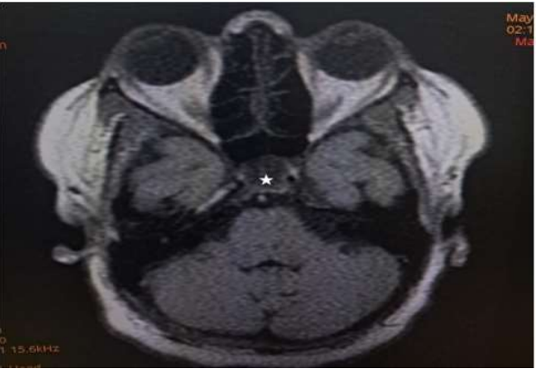 Figure 1: Axial T1W image of the brain showing a hypointense rounded intrasellar mass lesion (white asterisk).