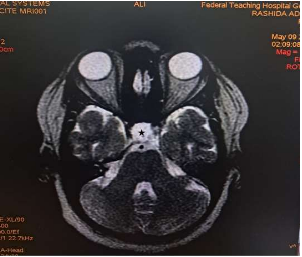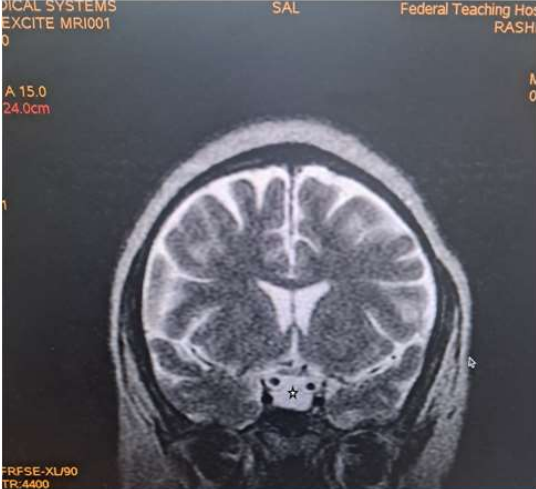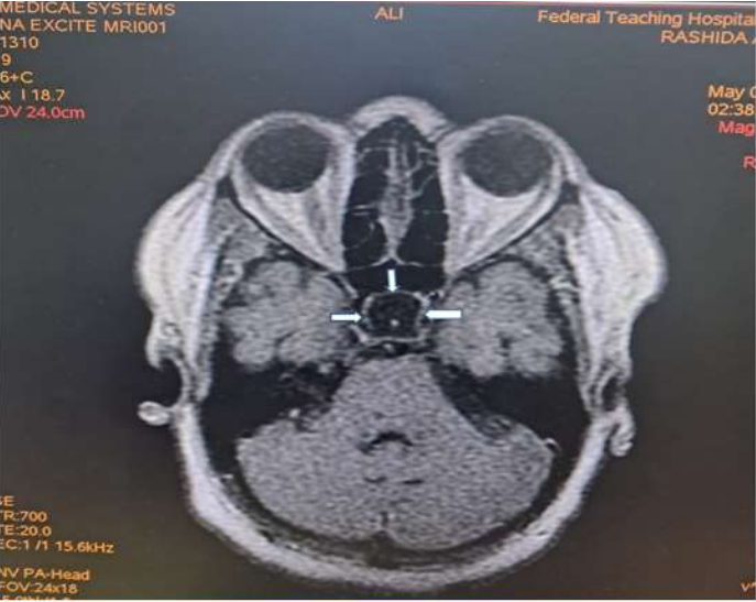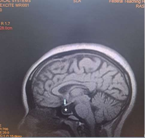 Mrs RA, a 35-year woman who was referred from a private hospital facility in Yola for a brain MRI with One-year history of recurrent headache which was dull aching in nature initially frontal and later became generalised with associated poor vision. She also has amenorrhoea for three months with marked reduction in libido. There is occasional galactorrhea. No heat or cold intolerance. No convulsion or loss of consciousness.