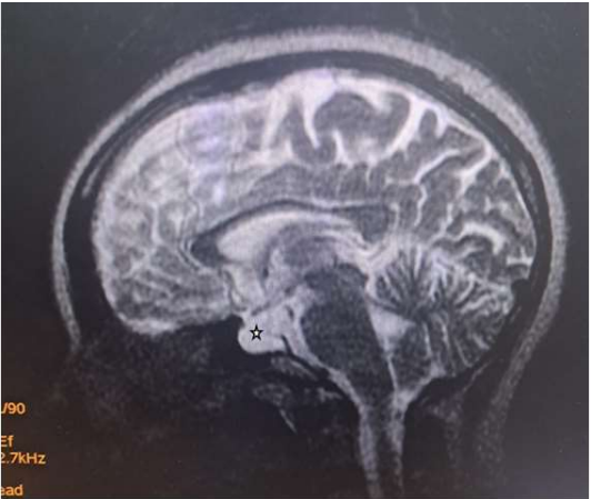 Figure 5: Sagittal T2W image of the brain showing a hyperintense rounded intrasellar mass lesion (black asterisk).