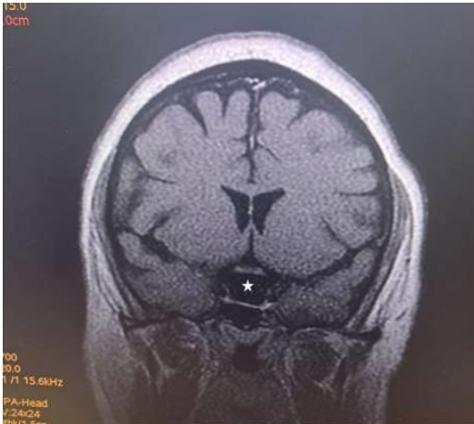 Figure 7: Coronal T1W image of the brain showing a hyperintense rounded intrasellar mass lesion (black asterisk).