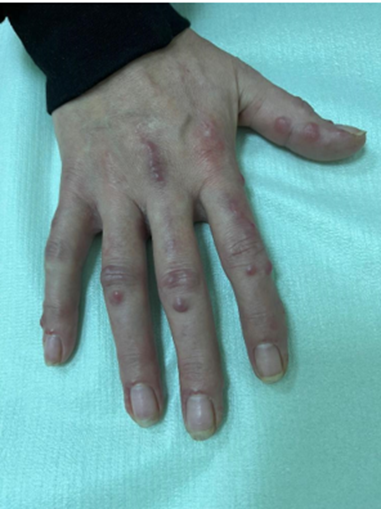 A 38-year-old patient was admitted to the Dermatology Department due to nodular and papulonodular skin lesions accompanied by severe itching. The lesions were symmetrically on the arms, forearms, hands' dorsum, and nail folds.