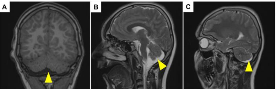 Figure 2: Brain MRI in a patient, Sibling 3, with chronic muscular dystrophy carrying a mutation in TMEM5. (A–C) Coronal and sagittal images showing cerebellar anomalies with yellow arrowheads.