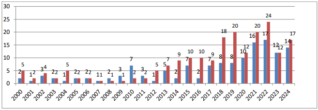 | 2022 | 273; 41 (15,0%) | 17 | 24 |