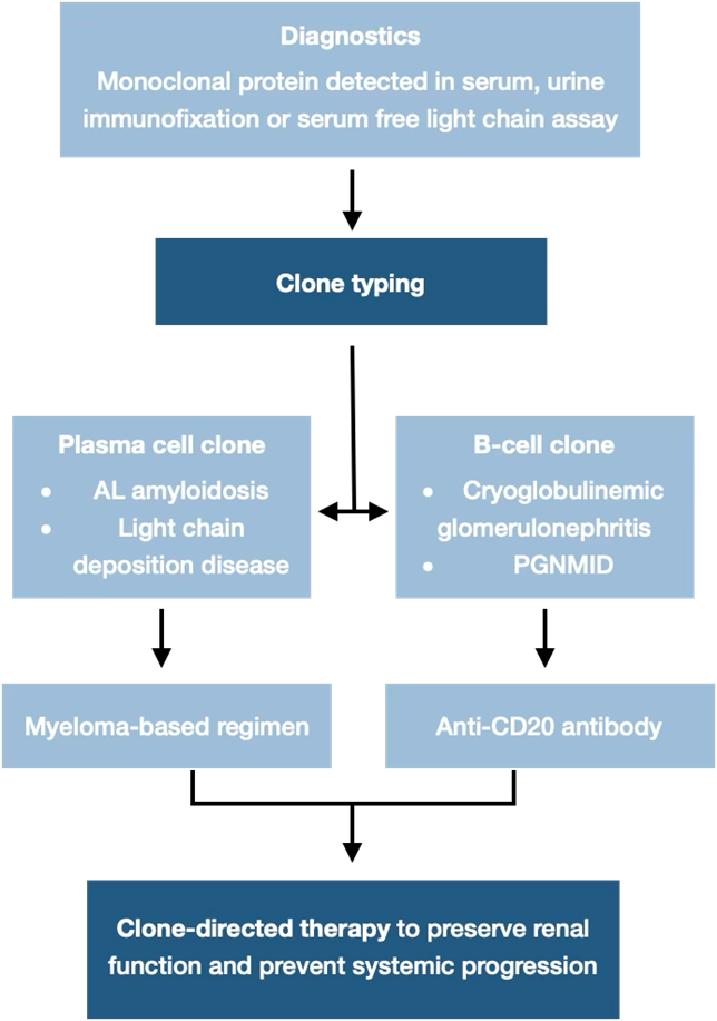 Figure 1: Proposed workflow. Diagnostic and therapeutic algorithm in MGRS, stratified by by clonal origin and renal lesion type. [2]