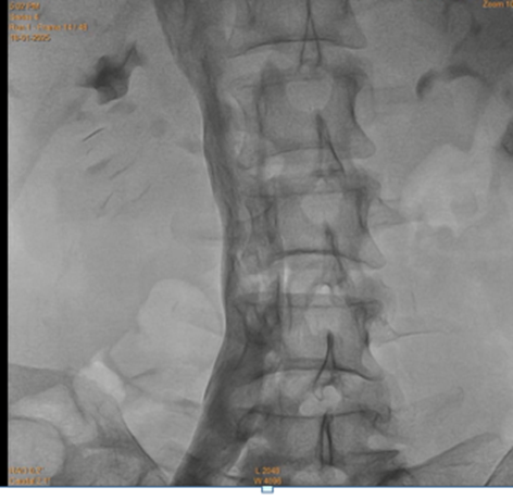 Figure 6: Left renal venography shows free flow into inferior vena vava, with hardly any reflux into gonadal vein.