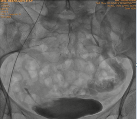 Keeping in view the possibility of Nutcracker syndrome (NKS). patient was taken up for percutaneous treatment. Right femoral vein puncture was done. Femoral vein angiography was done to see inferior vena cava (IVC), (Fig.1) to have idea of origin of left renal vein. Femoral artery access was also taken and left renal arteriography was done to trace renal vein in venous phase, but it could not be visualised. Since renal vein was not visualised, blind entry was done with terumo wire passed through right Judkins (JR)catheter. Catheter was then negotiated into LRV and venography was done (Fig. 2). It showed markedly dilated left gonadal vein (LGV), and left ovarion vein (Fig 3). Hardly any contrast was entering into IVC, due to compression by superior mesenteric artery (SMA). It was decided to put a stent in LRV across the compressed segment. To properly define the site of obstruction and stent placement, a JR catheter was placed in SMA (Fig 4), from left brachial artery approach. Self-expanding venous stent was then deployed, size 14x 60 mm. (Fig 5). LRV angio was then done which showed free flow of contrast into IVC and minimal reflux into LGV (Fig. 6). If, large reflux persisted, then coiling of LGV would have been required.