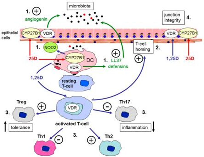 Figure 3: Vitamin D and barrier function in the gastrointestinal tract. Schematic representation of the expression of the vitamin D receptor (VDR) and vitamin D-activating enzyme (CYP27B1) in human colonic epithelial cells, antigen presenting cells such as dendritic cells (DC), and T cells. Immune responses to vitamin D occur either via systemic 1,25-dihydroxyvitamin D (1,25-(OH)2D) or local conversion of 25-hydroxyvitamin D (25-OH-D) to 1,25-(OH)2D. Possible target mechanisms include: 1) interface with microbiota (induction of antibacterials such as angiogenin, cathelicidin (LL37), defensins or intracellular pathogen recognition proteins such as nucleotide-binding oligomerization domain containing 2 (NOD2)); 2) T cell homing to sites of inflammation; 3) suppression of inflammatory Th17 and Th1 cells and induction of tolerogenic Treg and Th2 cells; 4) enhanced expression of epithelial membrane junction proteins. Original figure from Fletcher J et al. [76], MDPI